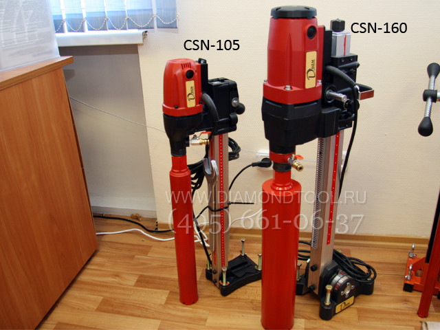 Прочная стальная сверлильная стойка является особенностью данных моделей алмазных установок, быстросъемное соединение сверлильной стойки и мотора, наличие редуктора для плавной подачи алмазной коронки. Отличительными особенностями является то, что сверлильная алмазная установка легко и быстро собирается и разбирается, регулировка наклона и настройка станины производится без использования специального инструмента. Данная модель электродвигателя со встроенной электронной системой защиты, для алмазного сверления отверстий до диаметра 160 мм. Соединительный хвостовик двигателя алмазной установки - универсальный, имеет внешнюю резьбы 1 1/4" и внутреннюю резьбу 1/2", т.е. подходит для алмазных коронок любых производителей.