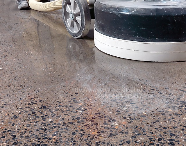 - Бетонный пол прежде всего шлифуется, чтобы получить требуемую плоскость и степень раскрытия заполнителя. При этом удаляется часто присутствующий более мягкий и нестабильный поверхностный слой бетона.