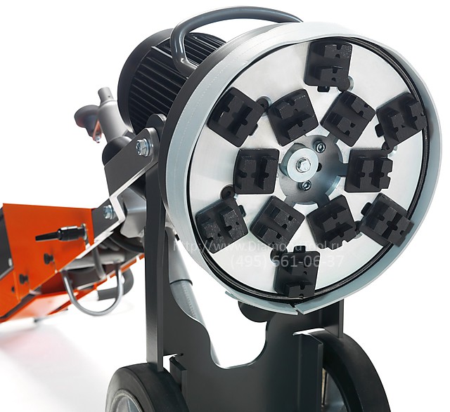 - Шлифование обязательно производится в несколько проходов: сегментами с зерном 20-30 (грубая шлифовка) и зерном 60 (средняя шлифовка). Для достижения максимальной производительности и ресурса алмазного инструмента, сегменты подбираются по соответствующей марке бетона. На шлифовальную машину PG 820 устанавливается 1 комплект из 18 алмазных сегментов.