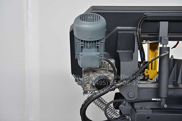 - Бесступенчатая регулировка скорости ленточнопильного полотна в стандартной комплектации. Позволяет точно настроить режимы резки под конкретную заготовку, тем самым увеличить срок службы ленточнопильного полотна.