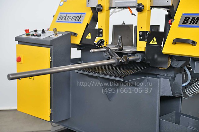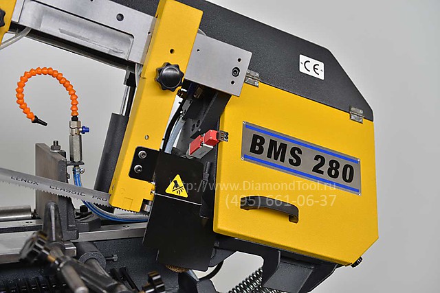 Ленточная отрезная пила с ручным управлением BMS 280 от турецкого производителя Beka-Mak с длиной ленточного полотна 3400 мм, высотой рабочей поверхности 640 мм и скоростью резания 20-100 м/мин используются при небольших объемах производства. Оператор станка самостоятельно устанавливает, отмеряет и фиксирует заготовку с помощью ручных тисков. Пильная рама опускается под собственным весом, скорость опускания регулируется с выносного пульта управления. Предназначена для резки сплошного и профильного металлопроката преимущественно под углом 90º диаметром до 280 мм.