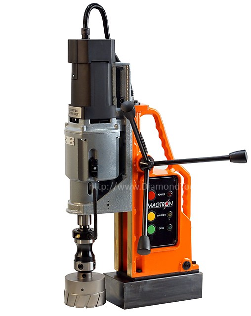 Магнитный сверлильный станок Magtron MBE 100FR+ является самым мощным станком в линейке станков британского производителя. Мощный немецкий двигатель с четырехступенчатым редуктором, электронной регулировкой скорости с контролем частоты вращения с помощью следящего устройства и защитой от перегрузки, оснащенный реверсом, позволяет не только сверлить отверстия диаметром до 130 мм, но и нарезать резьбу до М30. Шпиндель станка с конусом Морзе 3 расширяет возможности по использованию сменного инструмента. Так, безо всяких переходников можно использовать стандартные спиральные сверла с коническим хвостовиком диаметром до 32 мм. Напоминаем Вам об опасности злоупотребления спиральными сверлами на переносных сверлильных станках любых марок. Ресурс станка сокращается даже быстрее, чем падает производительность труда!