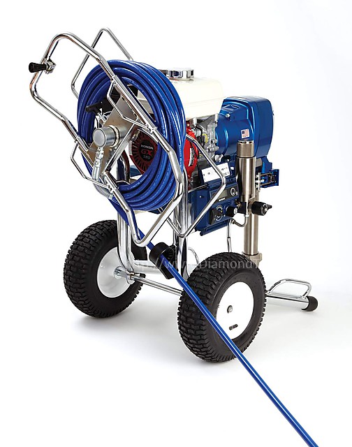 Окрасочный аппарат безвоздушного распыления Graco GMax II 5900 с бензиновым двигателем Honda мощностью 4,1 кВт и насосом нагнетающим давление 230 бар. Бензиновый двигатель дает преимущество в мобильности и автономности. Это обуславливает применение данного аппарата в полевых условиях, в местах отсутствия электричества. Аппарат эффективно и быстро наносит такие материалы как грунтовки, эмульсии, водоэмульсионные краски на основе растворителя, латексные краски, акриловые краски. Аппарат позволяет использовать два распылителя одновременно.