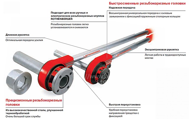 - Головки просто устанавливаются и снимаются: подходят ко всем ручным и электрическим резьбонарезным клуппам Ротенбергер.