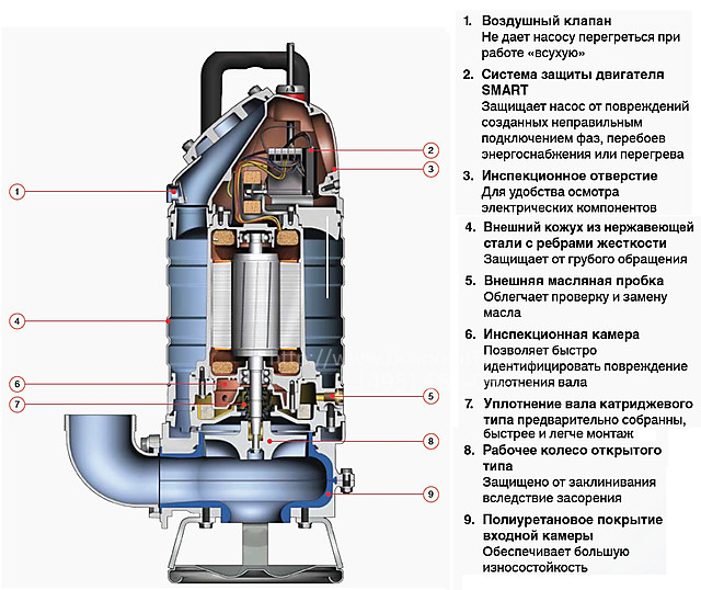 - Оснащен встроенным пусковым механизмом и электронной защитой от перегревов, перегрузок, неправильного подключения или обрыва фазы.